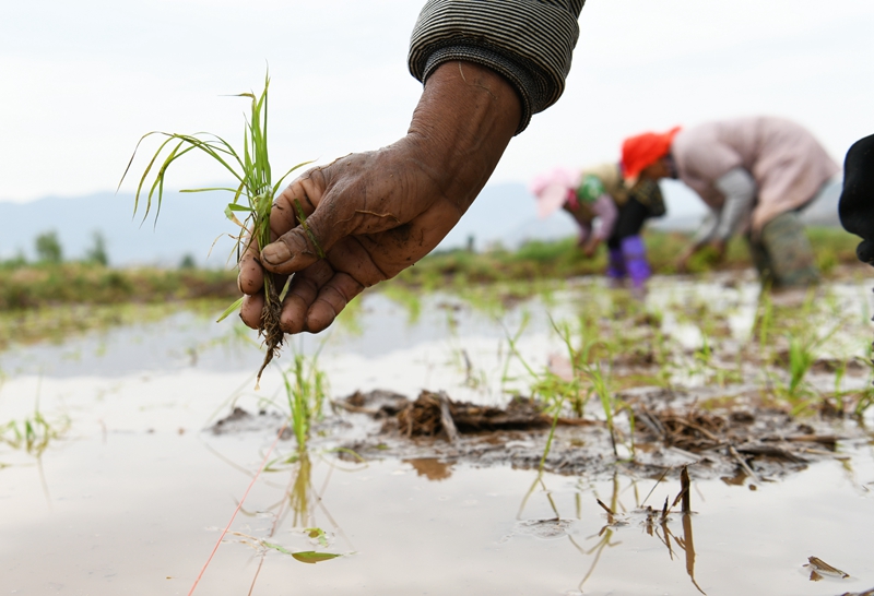 5月5日,農(nóng)民在云南省麗江市古城區(qū)金山街道東元社區(qū)的農(nóng)田里移栽水稻秧苗。 新華社發(fā)(趙慶祖?攝)