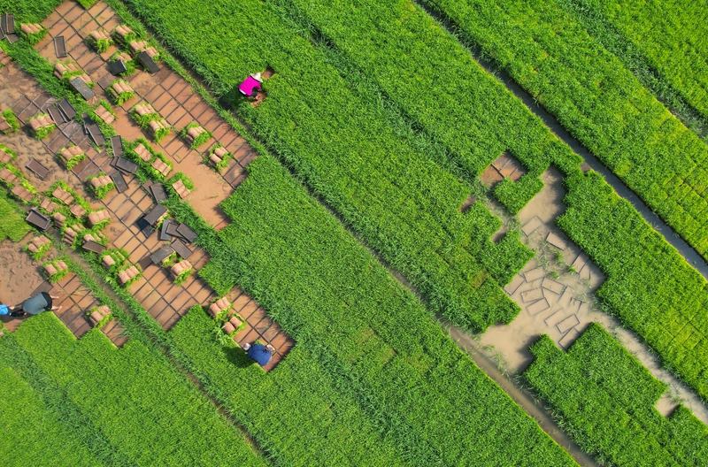 5月5日,村民在海南省三亞市天涯區(qū)檳榔村田間移秧苗。新華社發(fā)(陳文武?攝)