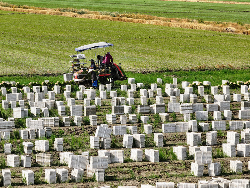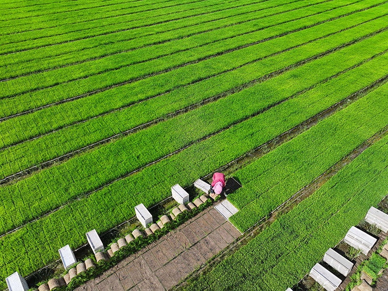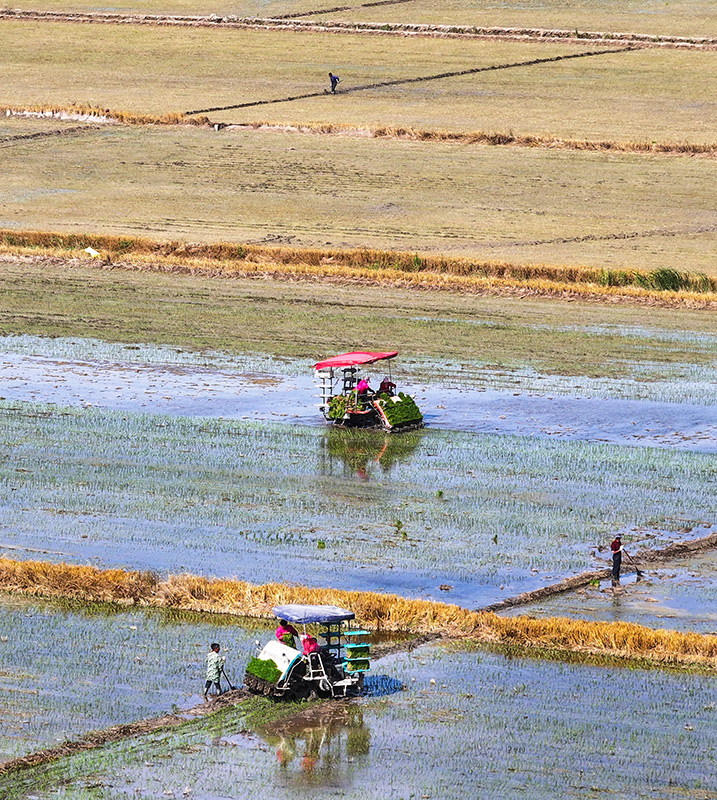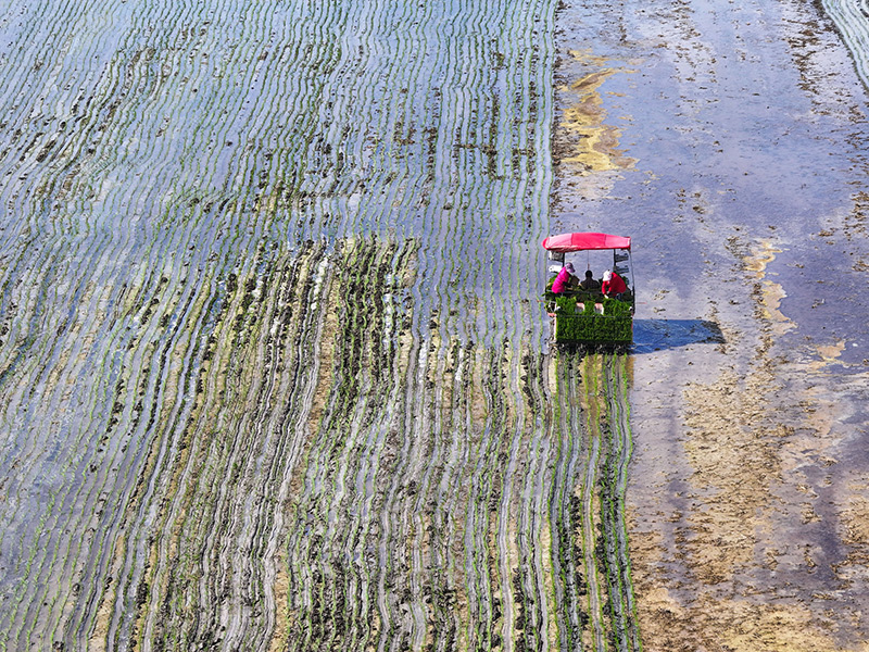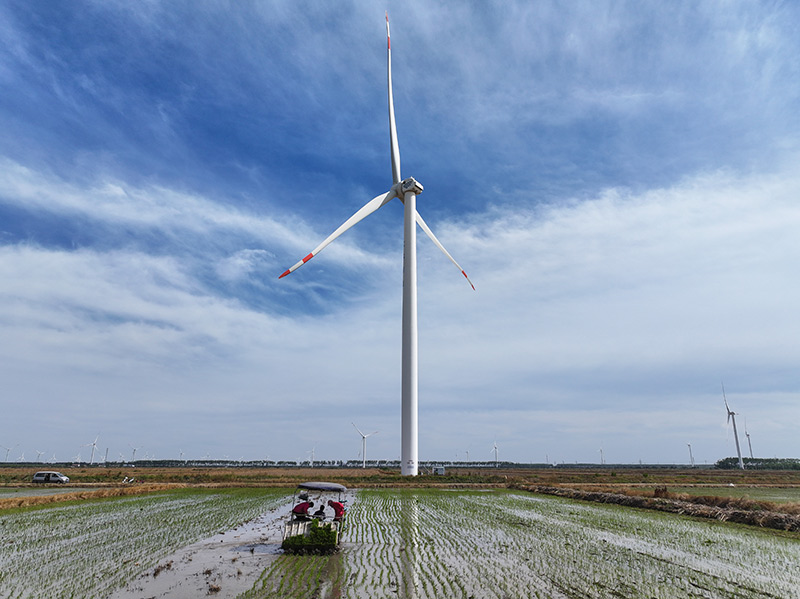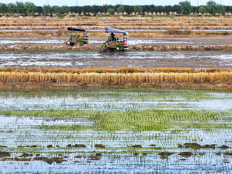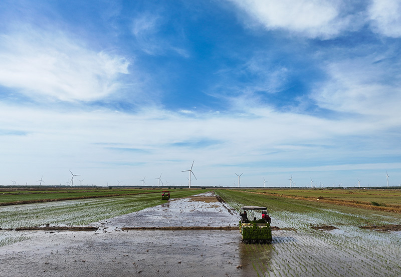 “三夏”時節(jié),位于江蘇省鹽城市射陽縣的江蘇農(nóng)墾臨海農(nóng)場搶抓農(nóng)時,開展機(jī)械化插秧作業(yè)。農(nóng)人、農(nóng)機(jī)、風(fēng)車在藍(lán)天白云映襯下,構(gòu)成一幅幅美麗的鄉(xiāng)村圖畫。據(jù)了解,今年臨海農(nóng)場水稻種植面積8.4萬余畝,目前插秧作業(yè)已完成過半。