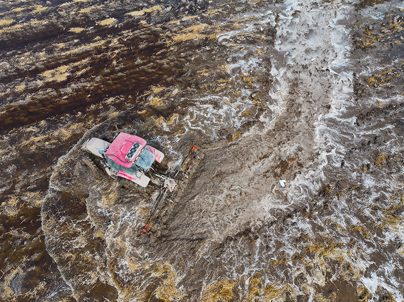 6月18日,農(nóng)業(yè)機(jī)械在臨海農(nóng)場一塊水田進(jìn)行起漿作業(yè)(無人機(jī)照片)。新華社記者 季春鵬 攝
