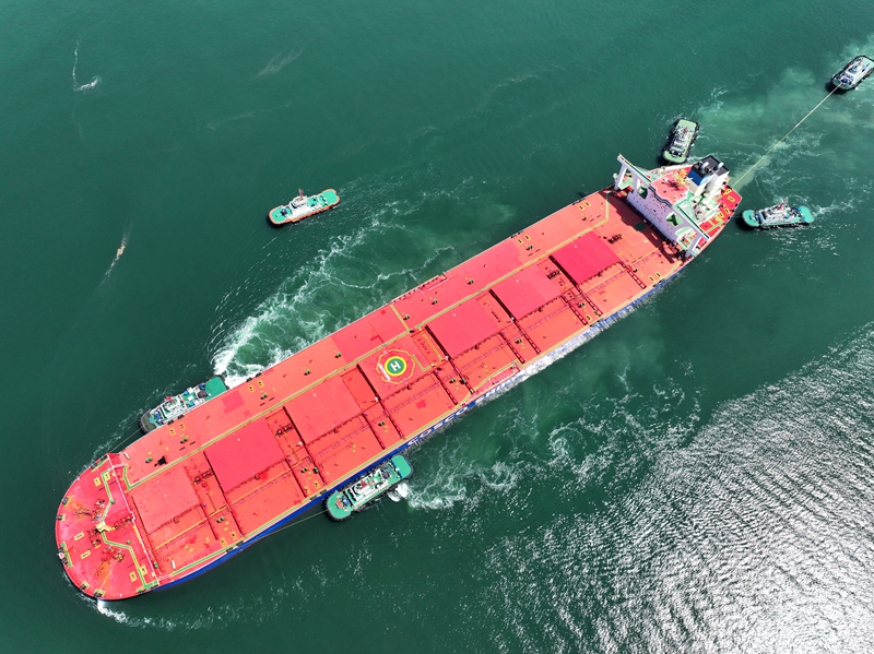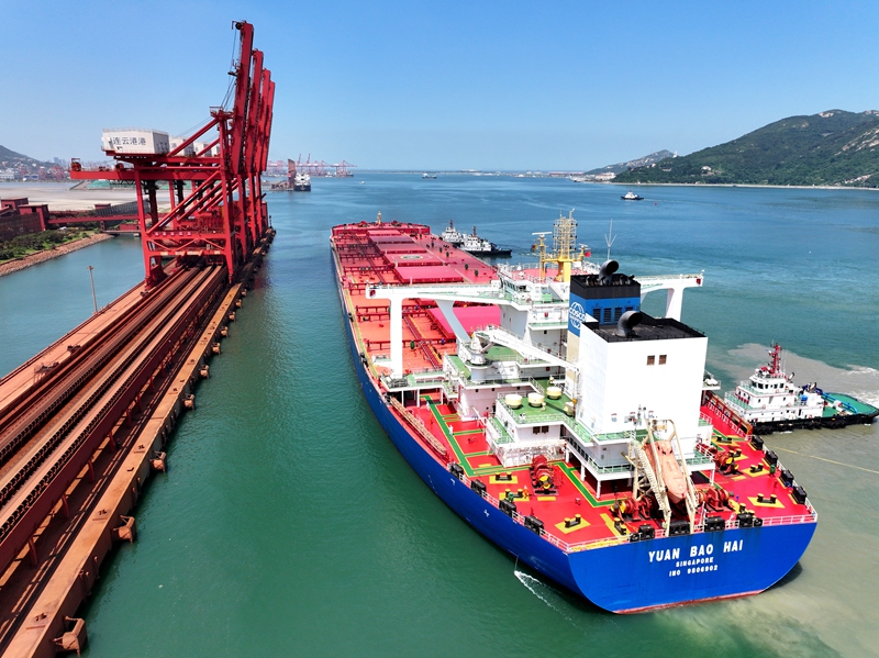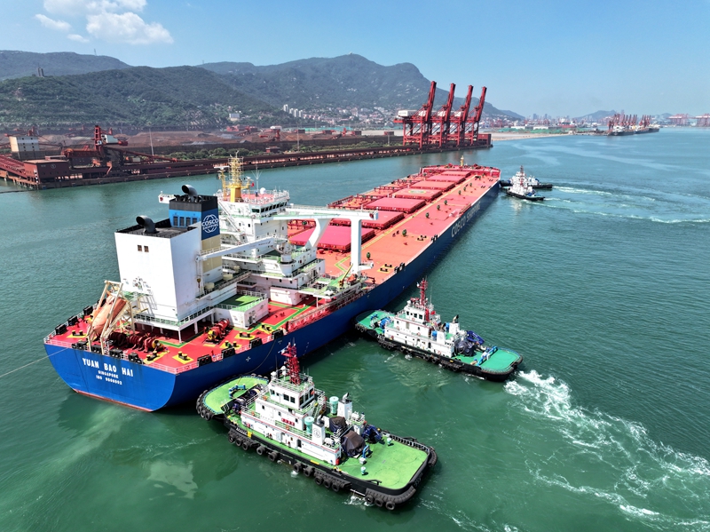 8月12日,從巴西駛來的滿載40萬噸鐵礦石的新加坡籍“遠(yuǎn)寶?!陛喛坎唇K省連云港新蘇港碼頭。該輪長362米、寬65米,是今年以來靠泊連云港的第15艘40萬噸級貨輪。新華社發(fā)(王春?攝)