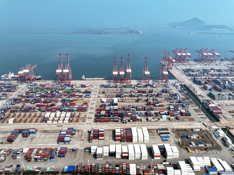 8月24日,在江蘇省連云港港集裝箱碼頭,貨輪正在裝卸集裝箱(無人機(jī)照片)。新華社發(fā)(王春 攝)