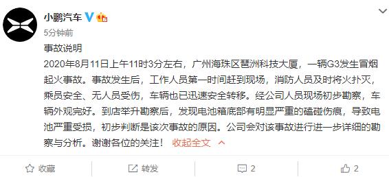 今天下午,小鵬汽車(chē)官微發(fā)布聲明對(duì)此事進(jìn)行了回應(yīng)。官方表示,2020年8月11日上午11時(shí)3分左右,廣州海珠區(qū)琶洲科技大廈,一輛G3發(fā)生冒煙起火事故。