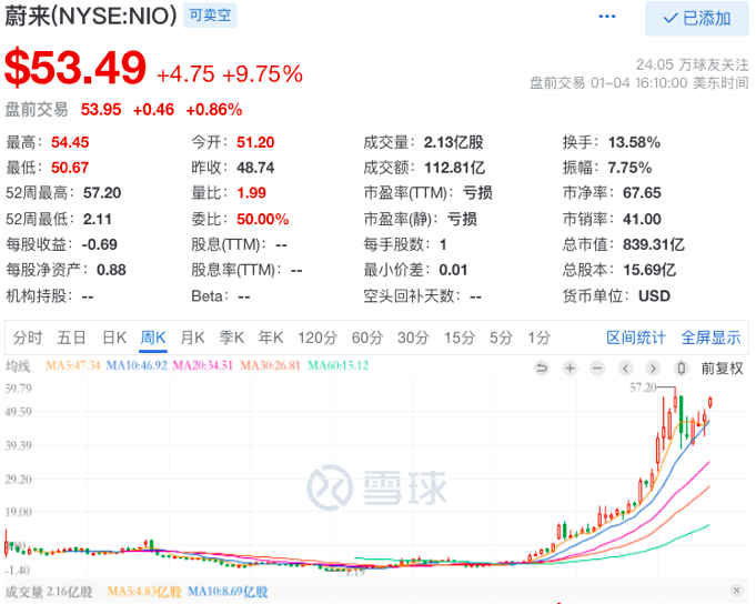 這一年中蔚來(lái)股價(jià)的暴漲更是成為資本市場(chǎng)的“神話”,從2019年10月2日1.19美元/股的最低點(diǎn)到2020年11月30日57.2美元/股的最高點(diǎn),蔚來(lái)股價(jià)暴漲48倍,江湖上到處都有兩元抄底蔚來(lái)一年實(shí)現(xiàn)財(cái)富自由的傳說(shuō)。