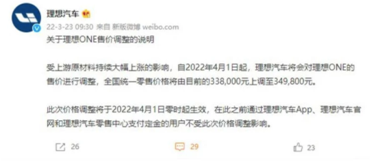 一方面,理想ONE在4月份進行了一次大幅度的調(diào)價,價格上漲幅度達到了1萬多,由于原材料價格上漲,幾乎所有新能源車型都在漲價,這其實可以理解。在理想汽車針對價格上漲的原因作出的回復(fù)中也表示,電池原材料成本上調(diào)導致價格上漲是最大的因素。 不過理想ONE作為增程式電動汽車,其實使用的電池包容量并不是很大,1萬多的漲價幅度著實有些夸張了。而且理想汽車在3月23日宣布, 4月1日起就迫不及待正式漲價了。