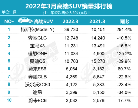 乘聯(lián)會(huì)統(tǒng)計(jì)的一季度銷量數(shù)據(jù)中,3月高端SUV(起售價(jià)30萬元以上)銷量榜:Model Y以近4萬輛的銷量奪冠,燃油車型集體下滑。此外,理想ONE、蔚來ES6、蔚來EC6躋身3月高端SUV銷量的前十,且同比均呈現(xiàn)正增長(zhǎng)。在高端轎車方面,雖然前十名的排行中沒有新能源汽車的身影,除了寶馬5系、奔馳E級(jí)與捷豹XFL以外,其他車型銷量均呈現(xiàn)不同程度的同比下降。
