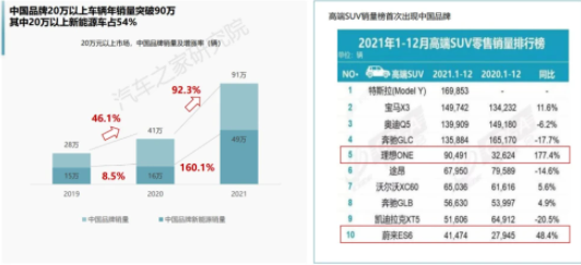 價(jià)格是支撐中國(guó)品牌向上的基石,隨著中國(guó)品牌持續(xù)向高端化進(jìn)軍,豪華車市場(chǎng)逐漸有了中國(guó)品牌的身影。汽車之家研究院統(tǒng)計(jì)數(shù)據(jù)顯示,2021年,中國(guó)品牌20萬以上車輛年銷量突破90萬輛。其中,20萬元以上的中國(guó)品牌新能源汽車占比達(dá)54%