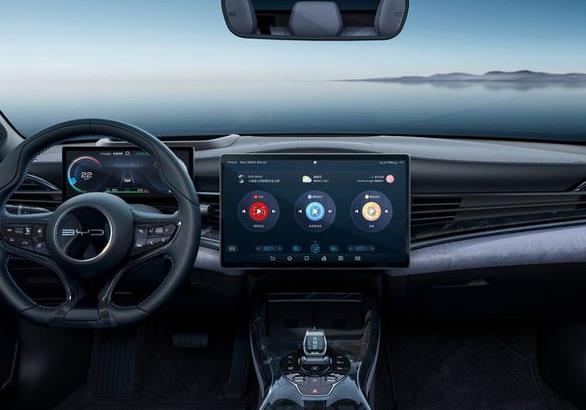 海豹內(nèi)飾同樣采用 “海洋美學(xué)”設(shè)計(jì)理念,采用了灰藍(lán)+黑的撞色設(shè)計(jì),設(shè)計(jì)以海洋為主線,儀表臺上部的起伏形態(tài)如同涌起的海浪,鋁金屬色的裝飾條烘托了海豹的運(yùn)動感與年輕屬性。液晶數(shù)字式儀表和自適應(yīng)旋轉(zhuǎn)懸浮Pad則是比亞迪的標(biāo)志性設(shè)計(jì)。作為儀表臺的視覺核心,平直延展的裝飾線條拉伸了車內(nèi)的橫向視覺寬度。