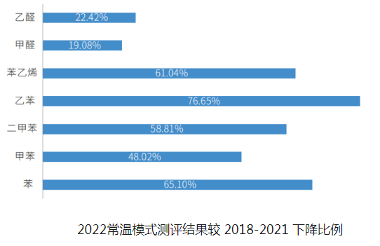 2022年度車內(nèi)空氣質(zhì)量測評結(jié)果顯示,常溫狀態(tài)下,除丙烯醛外,其余7種揮發(fā)性有機(jī)物均較2018-2021年有不同程度下降,一類致癌物甲醛和苯分別下降19.08%和65.10%,其余五種物質(zhì)也分別有22.42%至76.65%的下降。