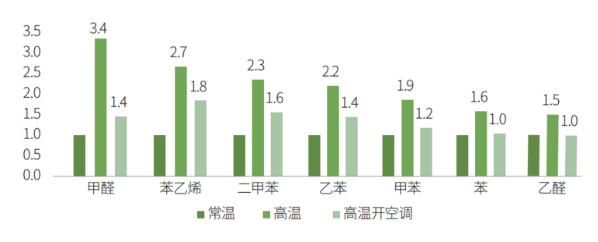 高溫模式下的揮發(fā)性有機(jī)物測評結(jié)果不如人意,濃度平均為常溫下的2倍。甲醛、乙醛、二甲苯和苯乙烯分別為常溫模式的3.8倍、1.5倍、2.3倍和2.7倍。由此可見,消費(fèi)者“溫度越高,車?yán)镂兜涝酱?rdquo;的樸素感知與測試結(jié)果相符,高溫下的車內(nèi)污染問題亟待解決。