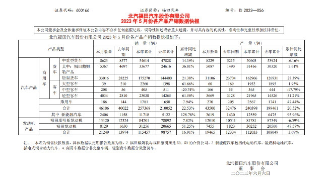 福田汽車發(fā)布最新銷量 新能源1-5月同比增128.78%