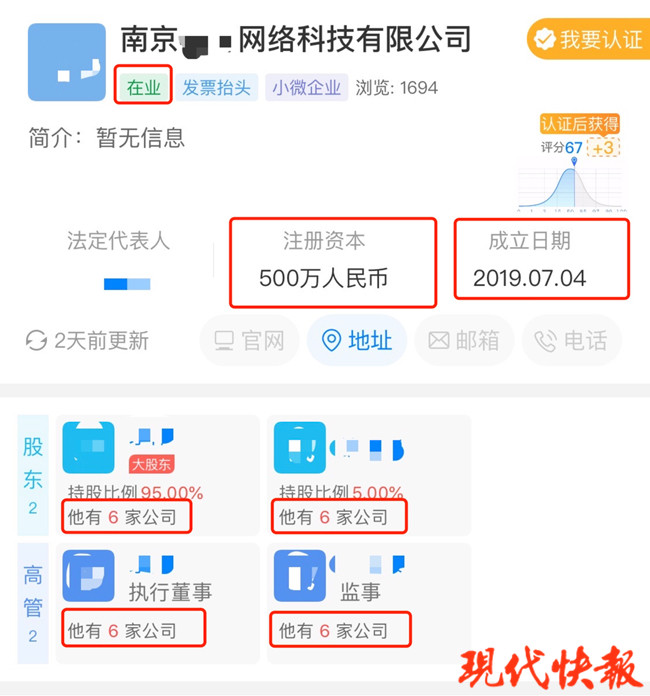現(xiàn)代快報記者通過天眼查輸入這些涉事學(xué)生姓名發(fā)現(xiàn),這些被注冊的公司大多為網(wǎng)絡(luò)科技、人力資源、物流運輸?shù)刃∥⑵髽I(yè)。注冊資本皆為500萬元。注冊時間集中在2019年5月至8月之間。這些企業(yè)有股份公司,也有獨資公司,涉事學(xué)生之間還互相兼任公司股東、執(zhí)行董事、高管等職位,形成了一個龐大的關(guān)系網(wǎng)絡(luò)。而且,絕大部分公司目前仍處于在業(yè)狀態(tài)。