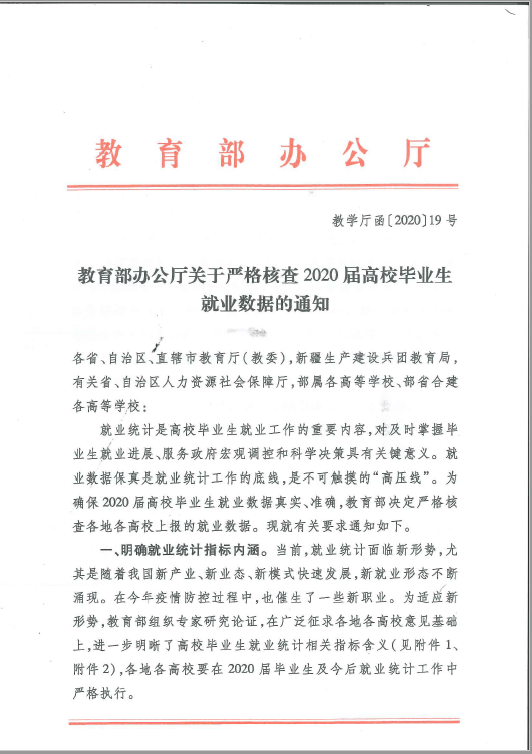 近日,多個地方教育主管部門和高校網(wǎng)站公布了《教育部辦公廳關(guān)于嚴(yán)格核查2020屆高校畢業(yè)生就業(yè)數(shù)據(jù)的通知》,明晰了高校畢業(yè)生就業(yè)統(tǒng)計指標(biāo)。