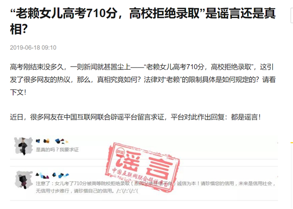 辟謠文章:“老賴女兒高考710分,高校拒絕錄取”是謠言還是真相?