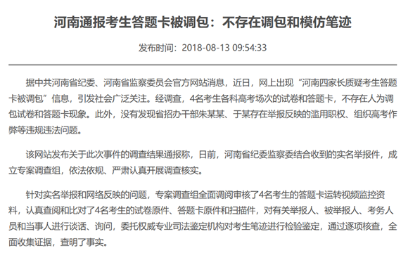 辟謠文章:河南通報考生答題卡被調(diào)包:不存在調(diào)包和模仿筆跡