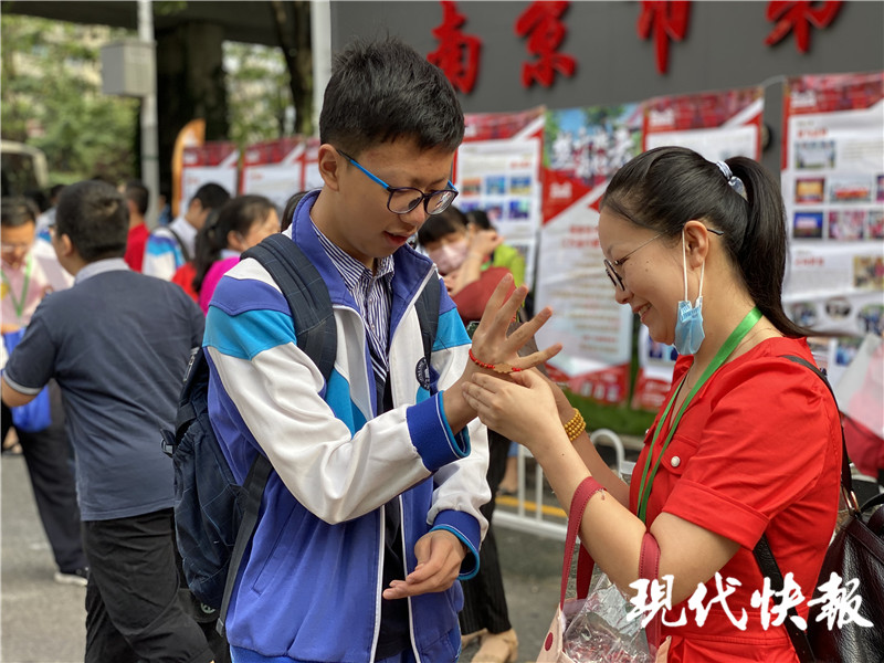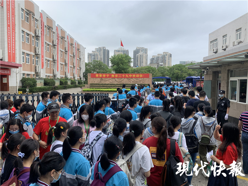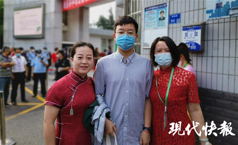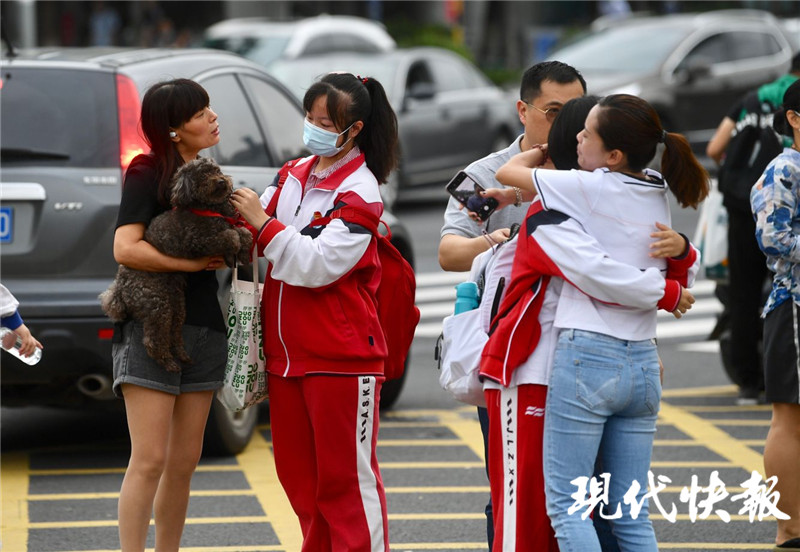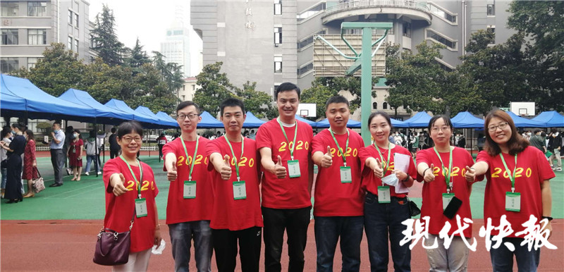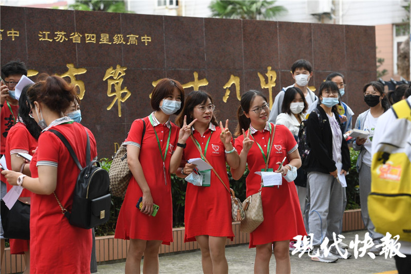 南京市金陵中學(xué)河西分??键c(diǎn)門口,來(lái)自幾所學(xué)校的考生分批有序進(jìn)場(chǎng)。送考老師和家長(zhǎng)們穿上紅T恤、旗袍,用一個(gè)個(gè)大大的擁抱為學(xué)生們加油!