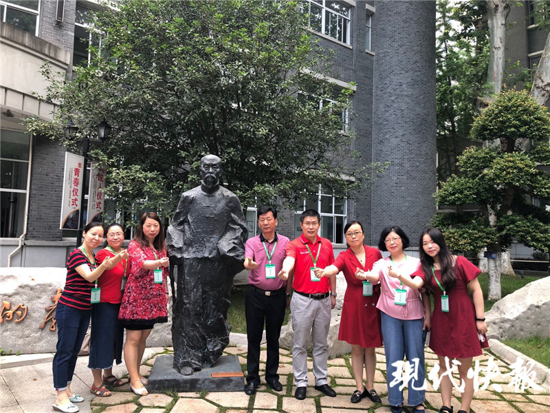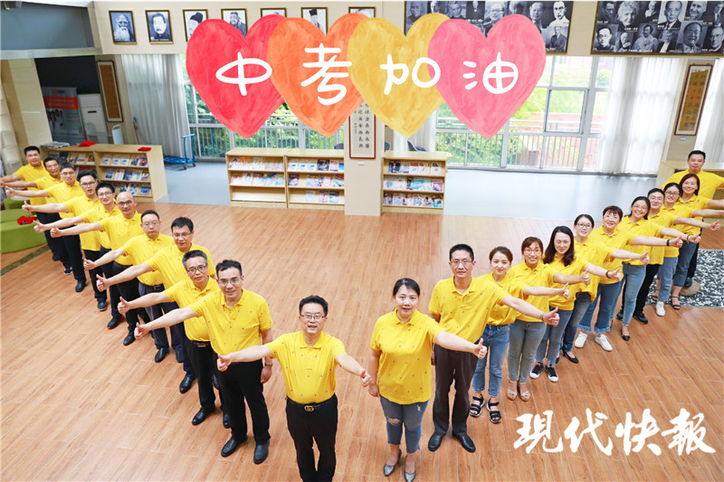 南京大學(xué)附屬中學(xué)中考考點(diǎn)外,來(lái)自南京市第五十中學(xué)和濱江中學(xué)的送考老師早早來(lái)到校門口為學(xué)生檢錄。濱江中學(xué)送考老師統(tǒng)一穿上了大紅色T恤,胸前寫著“2020濱中加油”字樣。等同學(xué)們集結(jié)完畢,幾位穿著紅T恤的老師站在一起,為同學(xué)們加油送祝福:“鎮(zhèn)定自信,正常發(fā)揮,中考必勝,加油吧同學(xué)們!”