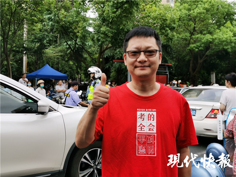 在南京市第二十九中學(xué)考點(diǎn)參加中考的考生,部分來(lái)自鼓樓實(shí)驗(yàn)中學(xué)。一對(duì)父母身穿紅色T恤,胸前寫著“考的全會(huì),蒙的全對(duì)”,吸引了不少人注意。“今天早上為了防止堵車,我和孩子?jì)寢屢粋€(gè)人騎電動(dòng)車,一人開車來(lái)送考,給孩子準(zhǔn)備雙保險(xiǎn)嘛。”送考的劉先生說(shuō),他們還是比較輕松的,今早為孩子準(zhǔn)備了紅豆糕等早點(diǎn),希望孩子可以在今天的考試中保持好心態(tài),取得好成績(jī)。