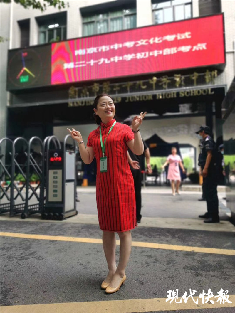 南京師范大學(xué)附屬中學(xué)樹人學(xué)校校長(zhǎng)孫小紅,一早就來(lái)到南京市第二十九中學(xué)初中部考點(diǎn)送考。她特意穿上豎條紋的紅色旗袍,祝愿考生們考試順順利利。