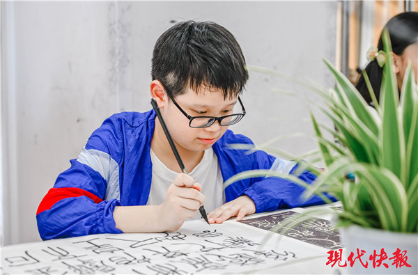 “我和姐姐是三年級(jí)暑假到書(shū)院學(xué)寫字的,今天我們會(huì)用小篆和隸書(shū)來(lái)參加比賽。”當(dāng)天,現(xiàn)代快報(bào)記者來(lái)到現(xiàn)場(chǎng),同學(xué)們正襟危坐,一筆一劃地書(shū)寫著,胡芷慕和姐姐胡芷菡是雙胞胎,姐妹倆都編著蜈蚣辮,穿著白色和紅色長(zhǎng)裙,看上去仙氣十足。