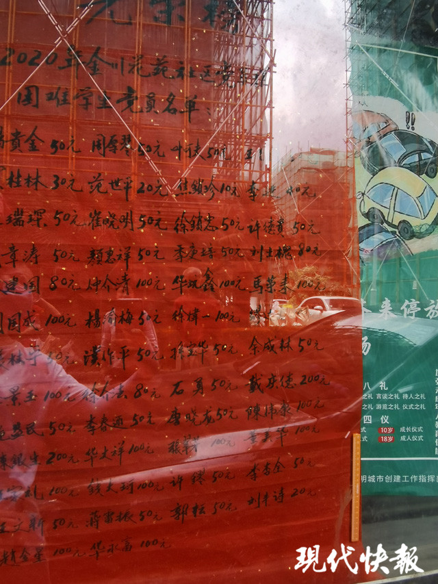 在離社區(qū)辦公室不遠(yuǎn)的宣傳欄內(nèi),貼著一張大紅色的光榮榜,記錄了捐贈人員的名字和愛心金額,從10元、20元到100元不等。金額雖然不高,但是人數(shù)不少,黨員居民匯聚點(diǎn)滴愛心幫助了身邊的困難家庭。這張光榮榜由金川花苑社區(qū)第五黨支部書記楊貴金所寫,他也是幫扶活動的負(fù)責(zé)人之一。