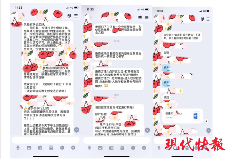 黃先生說,從班主任發(fā)布的信息來看,跟以往的通知格式很相似,多位家長紛紛回復(fù)“已收到”,并按照通知付款。但也有個別家長提出了質(zhì)疑。沒想到,群里的“班主任”見狀立馬退群,眾家長這才發(fā)現(xiàn)被騙。