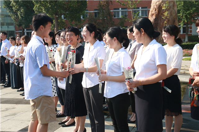 在中學部的晨會上,伴隨著《長大后我就成了你》的動人音樂,張文寒老師、竇靖老師、施宸老師和鐘欣老師,分別為當年的班主任張玉東校長、魏謙老師、徐福剛老師、陳環(huán)老師獻上鮮花,這份愛的傳承令在場的每一位師生都十分感動。