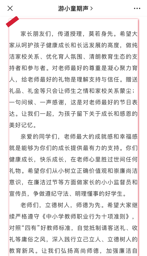 “對(duì)老師最好的尊重是凝心聚力育人,給老師最好的禮物是理解支持與信任。贈(zèng)送禮品、禮金等只會(huì)讓師生之情和家校關(guān)系蒙塵;一句問(wèn)候、一聲感謝,這是對(duì)老師最好的節(jié)日表達(dá)。讓我們一起,為孩子留下關(guān)于成長(zhǎng)和感恩的美好記憶。”