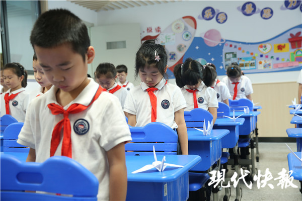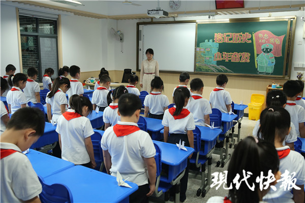 “特別提醒各位同學(xué),今天警報(bào)聲響起時(shí),請(qǐng)你放下手中的事,停下腳步,靜靜地站在原地默哀。”南師附小大隊(duì)輔導(dǎo)員胡穎告訴記者,希望每位同學(xué)銘記這個(gè)屈辱的日子,為戰(zhàn)爭(zhēng)中無(wú)數(shù)的英烈悼念、默哀,學(xué)校在每個(gè)班級(jí)門口都掛起了國(guó)旗,還在防空警報(bào)響起前開設(shè)了一節(jié)晨會(huì)課,通過(guò)廣播的形式,告訴同學(xué)們九一八事變的這段歷史,希望他們珍愛和平、勤奮學(xué)習(xí)、嚴(yán)于律己、報(bào)效祖國(guó)。