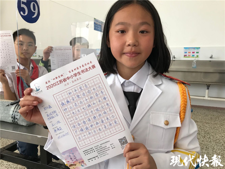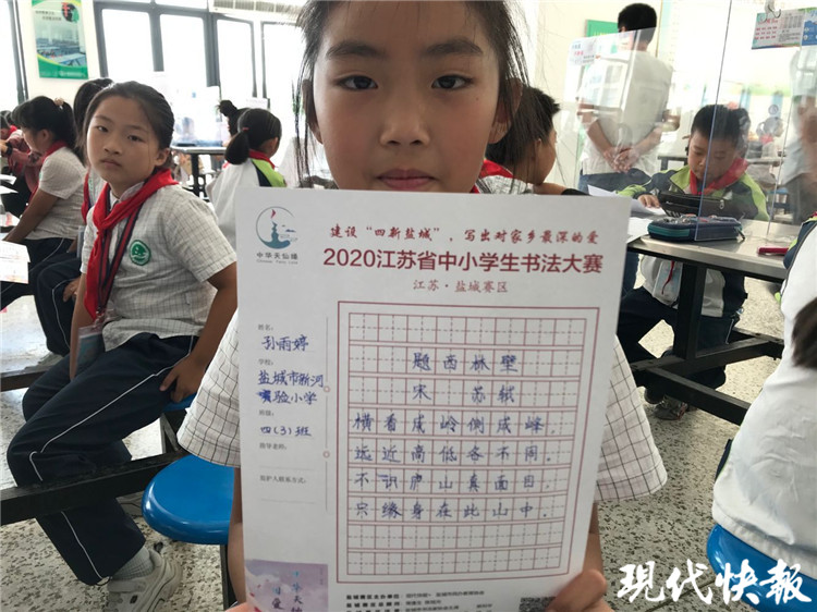 “孩子們抬頭挺胸,端正坐姿,正確握筆,一筆一畫書寫。”鹽城市新河實(shí)驗(yàn)小學(xué)的書法老師家徐萬虎和萬遠(yuǎn)峰、費(fèi)建、蔡紅梅等四位老師穿梭其中,指導(dǎo)孩子們認(rèn)真比賽。“媽媽很支持我,我每天都會抽時間練字。”四年級的學(xué)生孫雨婷雖然才練字1年時間,但她的字已顯成熟穩(wěn)重。