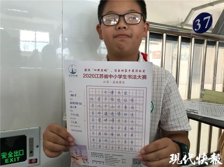 紅軍不怕遠(yuǎn)征難,萬水千山只等閑……六(4)班的車軒宇書寫有板有眼。“我練字3年了,之前看到同學(xué)寫毛筆字很好看,我就跟媽媽說,我也要去練字,現(xiàn)在每天還會抽空寫,徐老師給了我很多指導(dǎo)。”因?yàn)榍趭^練習(xí),2019年車軒宇還獲得了江蘇省“七彩語文杯”書法現(xiàn)場賽特等獎。