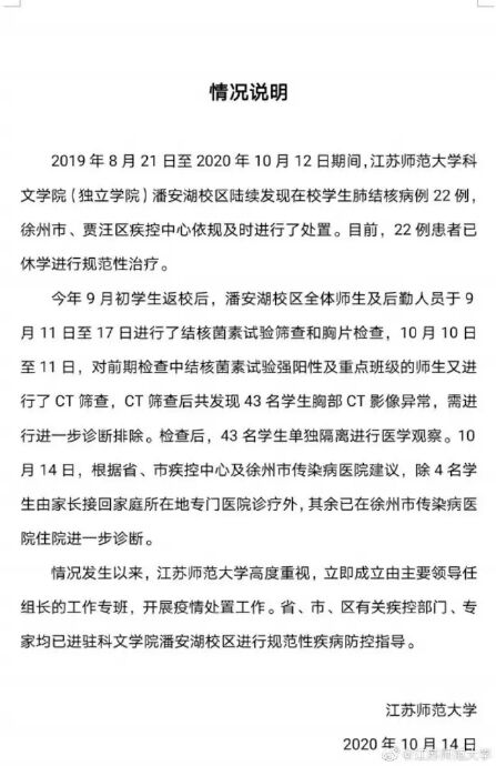 (記者 李偉豪)10月14日,江蘇師范大學(xué)官方微博發(fā)布情況說明稱,有22名在校生患肺結(jié)核,均已休學(xué)治療。