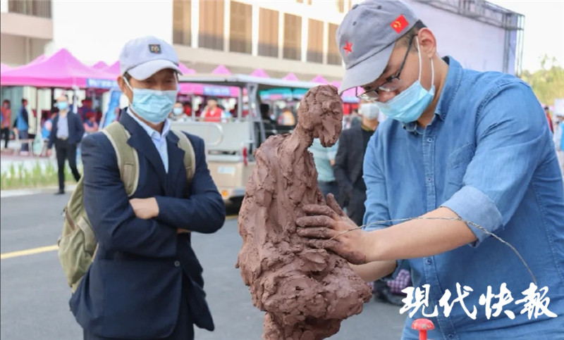 除了迎新禮物外,常大美術與設計學院的同學還迎來了進校來的第一次“現場教學”。“在展臺前現場做泥塑的是我們的一位大四學生,通過現場的美術創(chuàng)作讓新生更好地了解未來的學習狀況。同時我們還為來報到的新生準備了現場速寫,能夠在這迎新的活動中留下一份難忘記憶。這邊展示的兩幅壁畫是我們學生的代表作。”學院朱睿老師解釋。