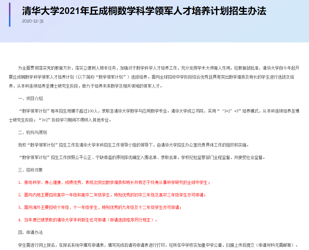 據(jù)悉,這是清華大學首次招初中學生。2018年起,該校開設丘成桐數(shù)學英才班,招生對象僅為普通高中三年級畢業(yè)生及普通高中二年級在讀學生。而新開展的“數(shù)學領軍計劃”則允許特別優(yōu)秀的初中三年級學生申請。