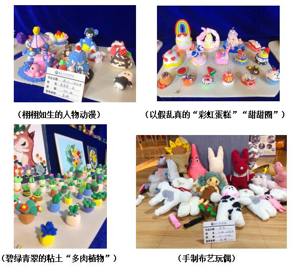 展臺上一個個獨具匠心的手工作品,融入了中華民族傳統(tǒng)的手工藝與現(xiàn)代手工制作。粘土,剪紙,衍紙畫,紙漿貼畫,布藝,編織,刺繡等手工作品,賺足了大家的眼球。學生代表還給前來參觀的師生分享自己做手工的經驗、想法以及制作過程等等,讓每一位喜愛手工的人都受益匪淺。