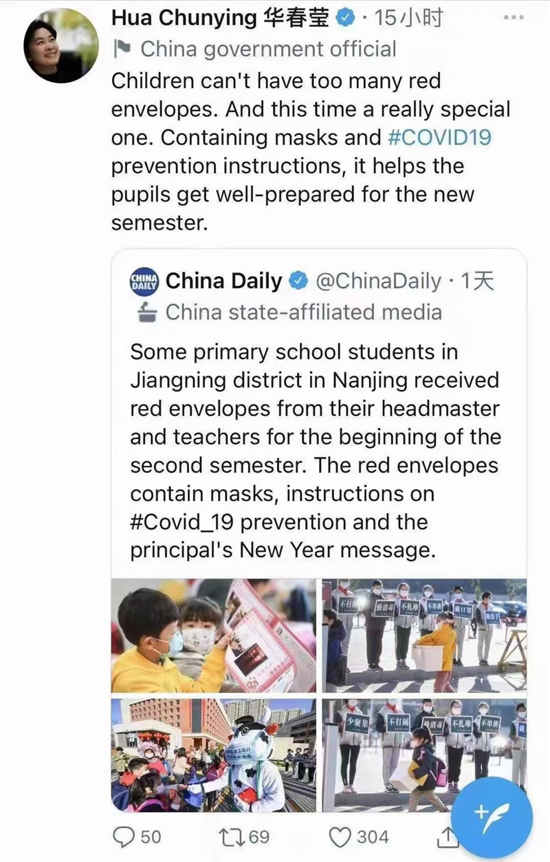 在社交網(wǎng)站中,華春瑩這樣寫道:“孩子無法擁有太多紅包,在這個(gè)時(shí)刻,這個(gè)紅包確實(shí)是很特殊的,這里面有口罩和防疫的提示,將會(huì)幫助孩子們更好地迎接新學(xué)期。”點(diǎn)贊江寧開發(fā)區(qū)學(xué)校!