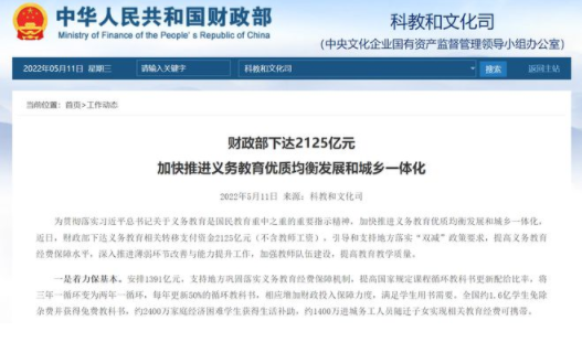 財(cái)政部:下達(dá)2125億元加速義務(wù)教育優(yōu)質(zhì)均衡發(fā)展