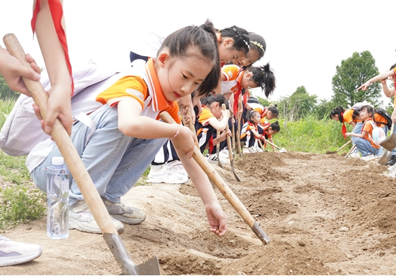 5月23日,四年級(jí)前往研學(xué)實(shí)踐基地——金盛農(nóng)莊。大家首先進(jìn)行手工面粉制作,只見孩子們眼神專注,在一篩一磨之間體味勞動(dòng)的快樂。隨后,孩子們拿起鏟子,種下一抹抹綠色,一棵棵蓬勃的生命在五月怒放。