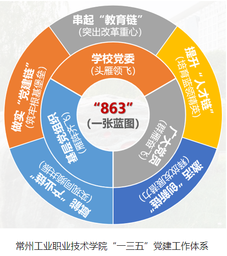 常州工業(yè)職業(yè)技術(shù)學(xué)院黨委不斷豐富“一三五”黨建工作體系內(nèi)涵,相繼推出《常州工業(yè)職業(yè)技術(shù)學(xué)院關(guān)于進(jìn)一步推進(jìn)新時代黨建示范創(chuàng)建和質(zhì)量創(chuàng)優(yōu)工作的實施意見》《常州工業(yè)職業(yè)技術(shù)學(xué)院關(guān)于實施“一三五”黨建工作體系的方案》《常州工業(yè)職業(yè)技術(shù)學(xué)院先鋒人物評選辦法》《“新能紅盟”行動——打造常州工業(yè)職業(yè)技術(shù)學(xué)院基層黨組織新能源黨建品牌建設(shè)項目實施方案》等黨建創(chuàng)新創(chuàng)優(yōu)舉措,將“加強(qiáng)黨的建設(shè)”融入高水平高職學(xué)校建設(shè)方案,以政治建設(shè)統(tǒng)領(lǐng)黨對學(xué)校工作的全面領(lǐng)導(dǎo),持續(xù)開展以“八大工程”“六大重點項目”“三十個核心指標(biāo)”為抓手的重點計劃,立足“學(xué)校黨委—基層黨組織—全體黨員”三級框架,精準(zhǔn)實施“頭雁領(lǐng)飛”“雁陣齊飛”“群雁奮飛”的三“飛”工程,開展“先鋒人物”評選,強(qiáng)化先鋒引領(lǐng),以“新能紅盟”等譜系化黨建品牌建設(shè)為載體促進(jìn)“五鏈耦合”,用“黨建鏈”串起具有高職教育類型特征的“教育鏈”,從而提升行業(yè)和企業(yè)急需的“人才鏈”、激活地方院校技術(shù)技能積累的“創(chuàng)新鏈”、賦能城市發(fā)展的“產(chǎn)業(yè)鏈”,推進(jìn)“城產(chǎn)教科創(chuàng)”融合發(fā)展。