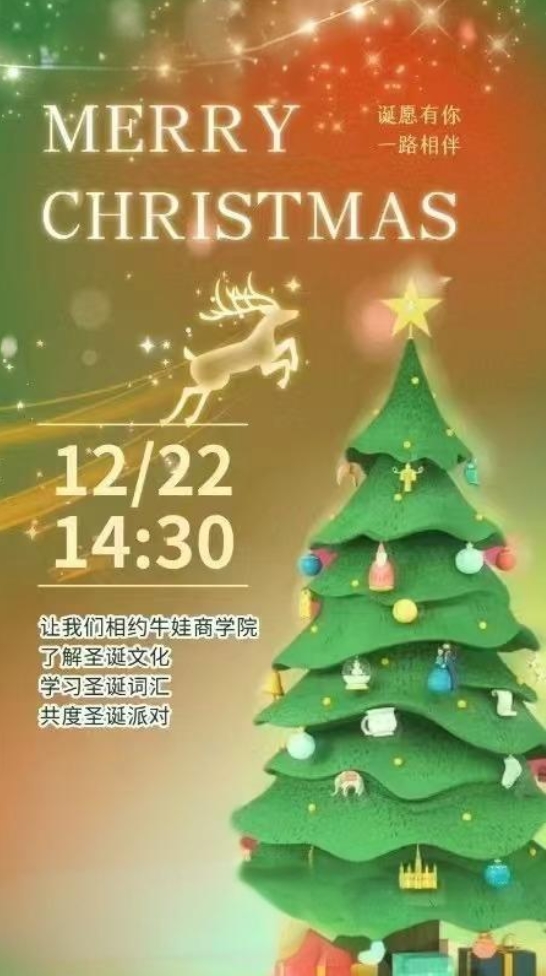 叮叮當,叮叮當,鈴兒響叮當……當圣誕的鐘聲敲響,牛娃商學院(位于金鷹北街區(qū)2樓)將變成一片歡樂的海洋。12月22日下午兩點半,我們特別邀請了新老學員及家長們,共同參加這場圣誕狂歡派對。在這里,你將有機會深入了解圣誕節(jié)的悠久歷史與獨特習俗,學習那些充滿趣味的圣誕詞匯,讓你的英語詞匯量在歡樂中悄然增長。