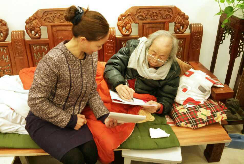 作者陳鳳玲在病榻前看望國畫大師張文昌