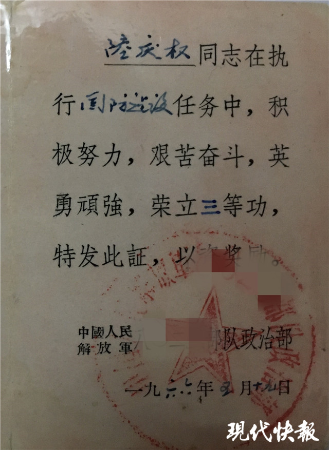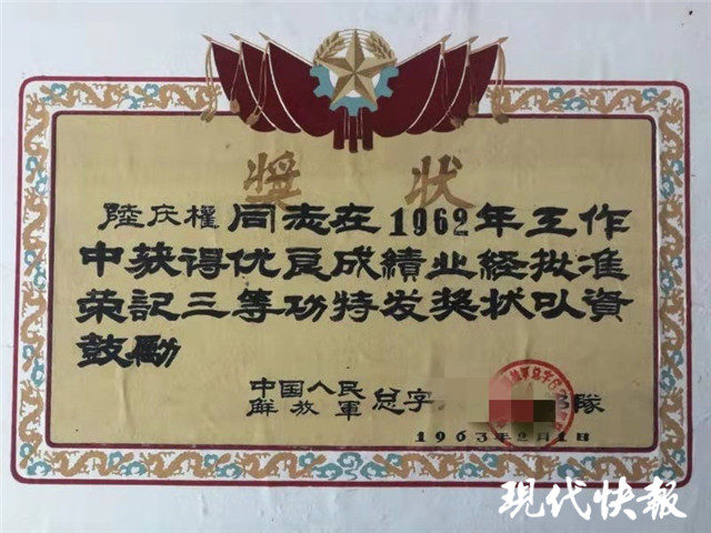直到2019年一天,社區(qū)工作人員在登記退伍老兵信息時(shí),偶然間發(fā)現(xiàn)陸慶權(quán)的三等功獎(jiǎng)狀,才揭開了這段塵封已久的往事。“這些事情組織上已經(jīng)給了我證書,沒必要拿出來顯擺,也不允許顯擺。”陸慶權(quán)說,要不是看到報(bào)紙、電視上播原子彈相關(guān)的新聞,他是絕對(duì)不會(huì)講出來的。