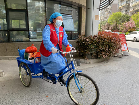 晚21時許,第一批封控區(qū)居民的生活物資包抵達(dá)小區(qū)南門。沈莉帶領(lǐng)社區(qū)干部一起,穿上大白、蹬上三輪,為封控區(qū)的156位居民,一趟一趟的運貨上門。而此時,沈莉已40多個小時沒有合眼了。