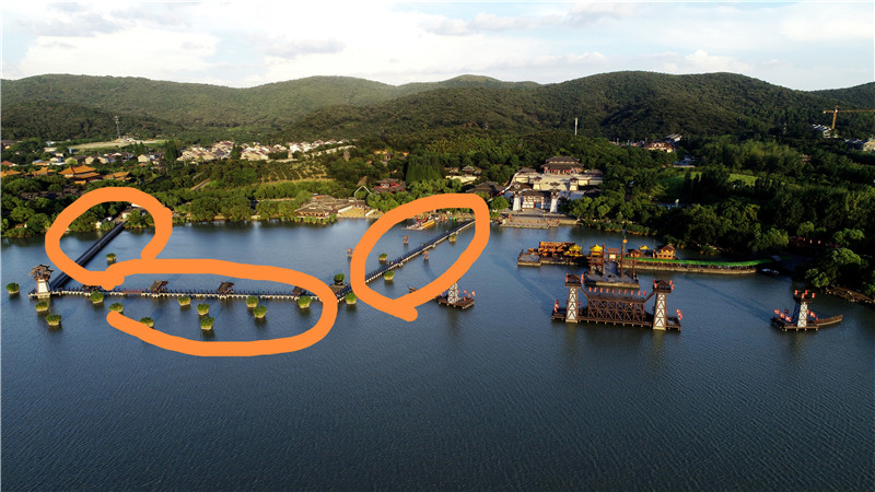 △梅雨季之前景區(qū)照片,圈出部分為目前被淹步道 無錫影視基地微信公眾號供圖