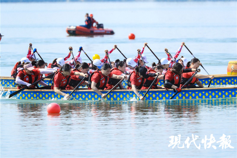 上午8點40分,伴隨著一聲哨響,參賽各隊的隊員們,迅速張開臂膀,整齊劃一地揮動船槳,劈波斬浪向終點前進。現(xiàn)場,鑼鼓聲、吶喊聲此起彼伏,連成一片,熱鬧非凡。