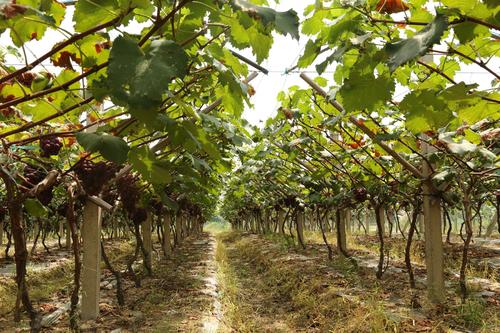 2004年全部用地種葡萄,葡萄種到了坡頂上,形成了“山有多高葡萄有多高”。2008年,群眾開始用水田種植葡萄,前進村葡萄產(chǎn)業(yè)進入了發(fā)展的快車道。在縣委政府的大力宣傳和扶持下,大家紛紛行動起來,培植幼苗、打綁樁、繃鋼絲,從大坪龍井到交梨村楊家坡馬坡,從坡頭到坡腳,處處水泥架林立,鋼絲網(wǎng)羅密分布,其它村也因地施策,充分利用荒山荒坡區(qū)域種植山地葡萄。大坡龍井山路崎嶇導致交通不便,開始時葡萄種植管理收成等的農(nóng)活,群眾全靠背或挑,人們汗流浹背,十分不易。后來在楊家灣坡前方?jīng)鐾ぬ?,群眾自建鐵索、鐵框,葡萄放在鐵框里,經(jīng)鐵繩下滑至交梨鄉(xiāng)。隨著產(chǎn)業(yè)的發(fā)展,修筑產(chǎn)業(yè)路可直通山上,采下新鮮的葡萄,可直接摘到車里,“萬畝葡萄基地”應運而生。
