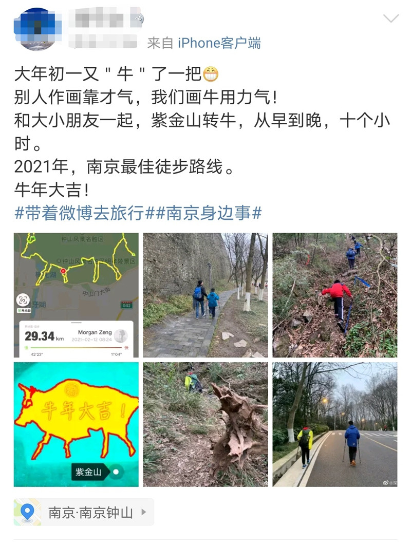 現(xiàn)代快報(bào)記者了解到,春節(jié)假期這幾天,幾乎每天都有不少市民參加徒步“畫(huà)牛”活動(dòng)。微博用戶(hù)“@深寧之”曬出了大年初一成功“打卡”該活動(dòng)的圖片,配文稱(chēng):“年初一又牛了一把。”“和大小朋友紫金山轉(zhuǎn)牛,從早到晚,十個(gè)小時(shí)。”