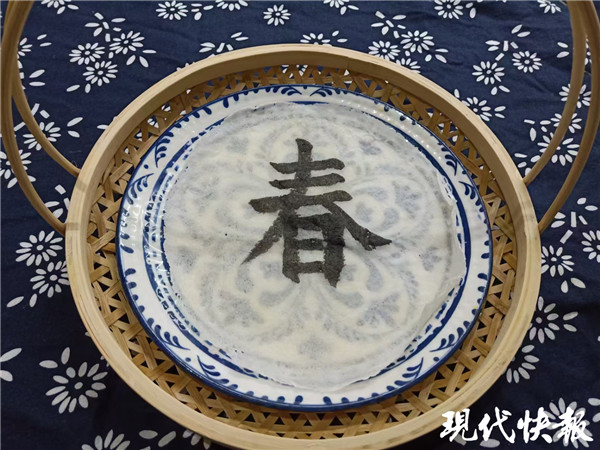 為了讓一家人的春節(jié)更有氛圍,陳正銀2月初就開始琢磨美食。“那天正好是立春,家里準(zhǔn)備了一些‘春’餅,我愛人在一旁寫毛筆字,我就突然來了靈感。”陳正銀想到,薄薄的“春餅”不就像宣紙嘛,宣紙上能寫字,在春餅上寫字會(huì)怎么樣?于是,他找來黑芝麻并磨成糊狀,在春餅上寫了個(gè)“春”字。“都說腹有詩(shī)書氣自華,把‘墨汁’吃到肚子里,新的一年也能收獲知識(shí)。”陳正銀很滿意這個(gè)作品。