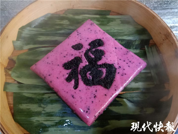 有了“春”餅的啟發(fā),陳正銀又開始做“福”糕。在用火龍果和糯米做成的年糕上,陳正銀借助模具用黑芝麻寫了一個(gè)“福”字。“我們中國(guó)過年最喜歡的字就是福,這個(gè)寫有福字的年糕,可以把福氣吃進(jìn)肚子里。”陳正銀說,為了保證福字上鍋蒸后仍不變形,火候和時(shí)間的把握很關(guān)鍵,需要多嘗試才能掌握技巧。