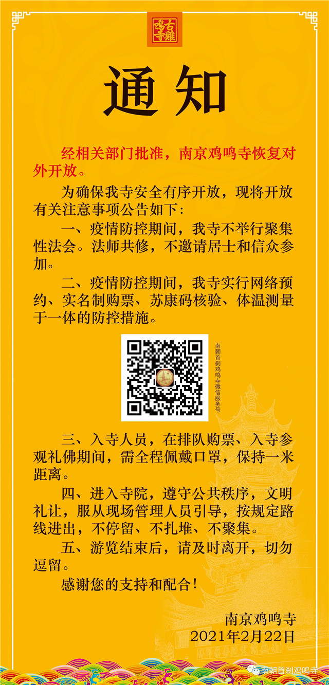 (記者 李鳴)2月22日,現(xiàn)代快報(bào)記者了解到,經(jīng)相關(guān)部門批準(zhǔn),雞鳴寺將于2月23日恢復(fù)對(duì)外開放。